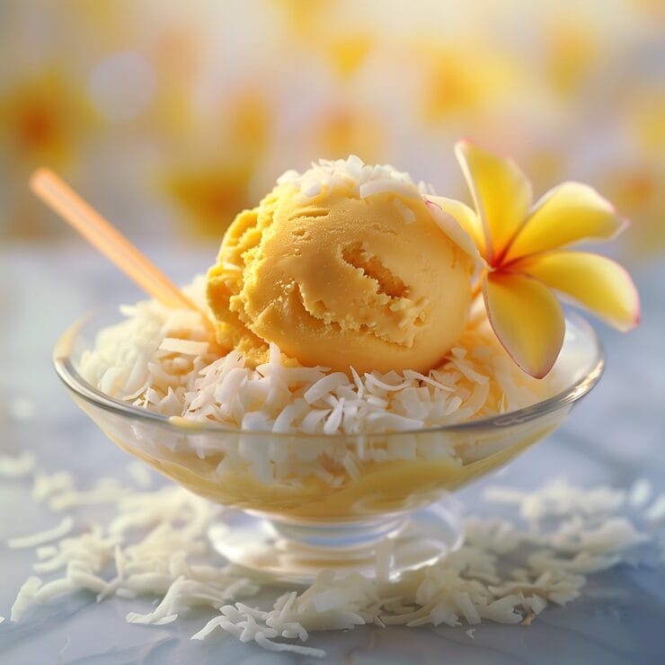 Vanilleeis mit Mangosauce, frischer Mango und Erdnüssen