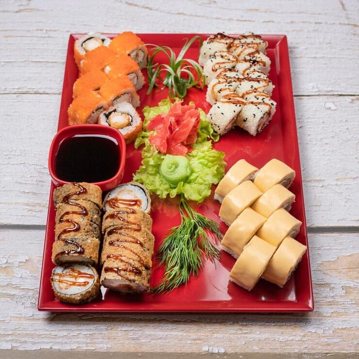 12 Maki (Lachs, Thunfisch), 1 Nigiri (Lachs)