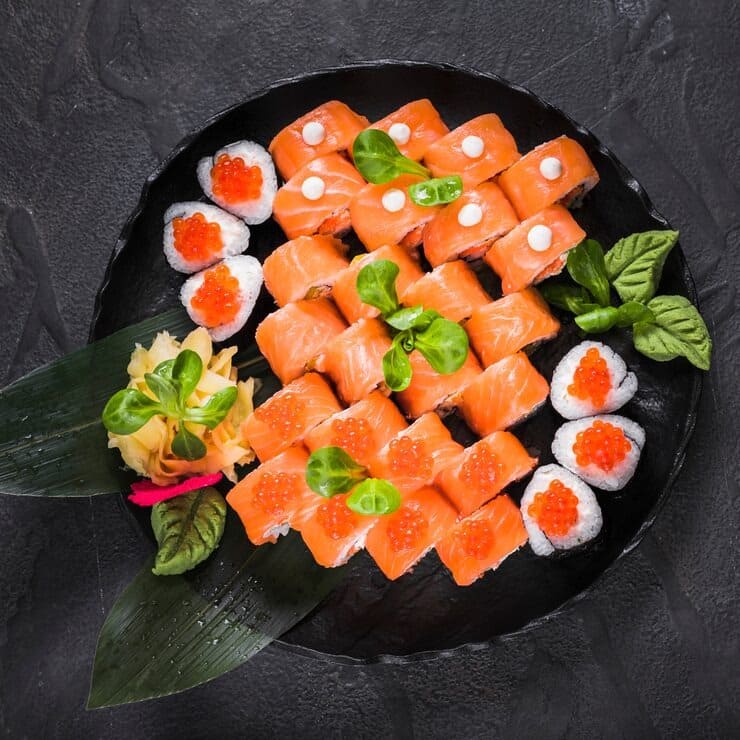 2 Nigiri (Lachs, Thunfisch), 6 Maki (Lachshaut), 4 I-O (Lachs)