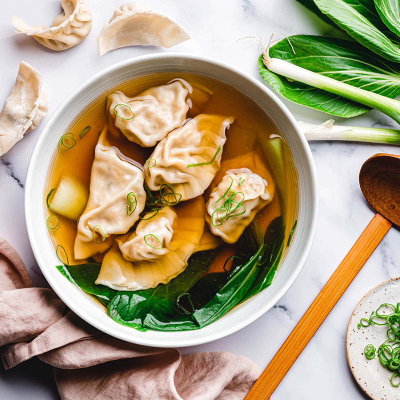 hausgemachte Wan-Tan-Teigtaschen, gefüllt mit Hühnerfleisch, Garnelen, dazu Gemüse und frische Kräuter