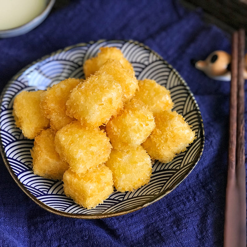 (3 Stk) knuspriger Tofu mit Reisflockenmantel, gemischtem Salat und Spezialdressing